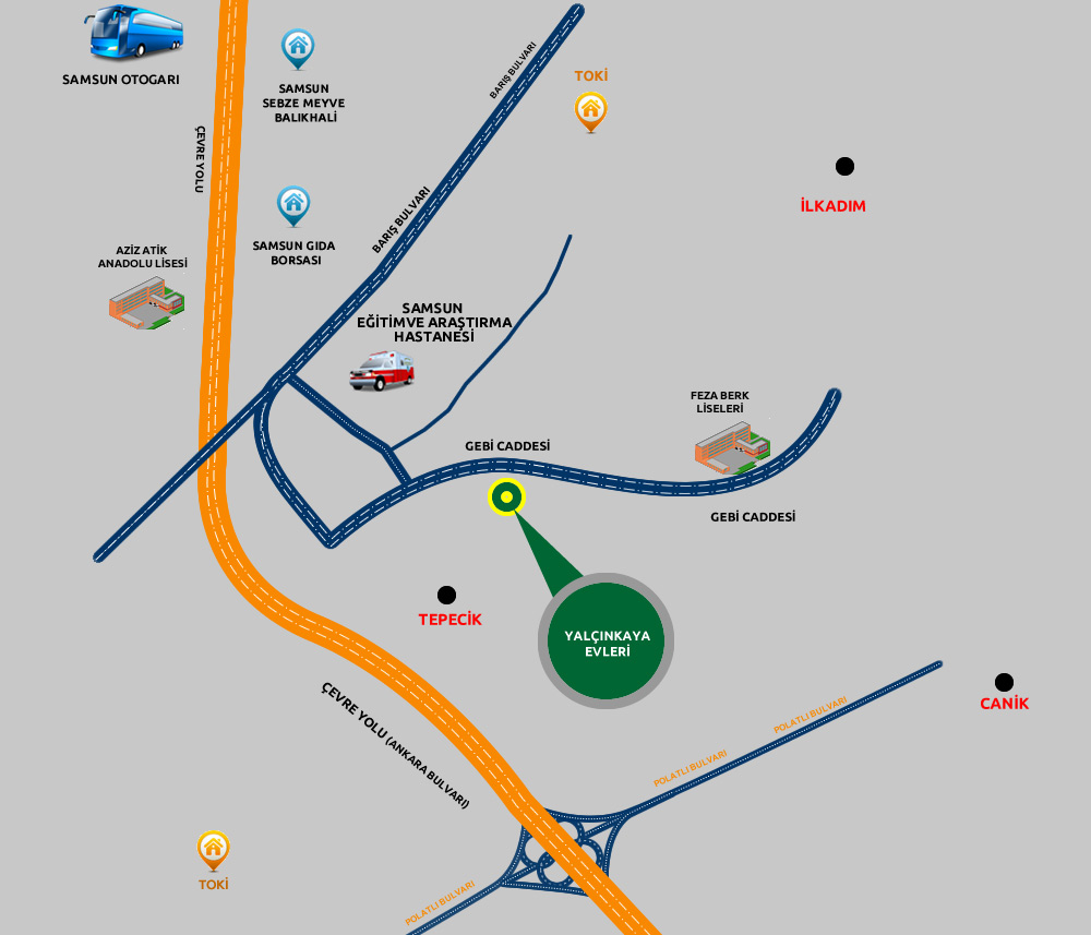 Yalçınkaya Evleri, huzurlu, bol oksijenli ve konforlu bir yaşam alanıdır. Samsun’un geleceği parlak yatırım bölgesi olan Tepecik’te konumlanmış olup, Eğitim ve Araştırma Hastanesi’ne 0.5 km, çevre yolu çıkışına 1 km ve 100.Yıl Bulvarı'na 3 km mesafededir.